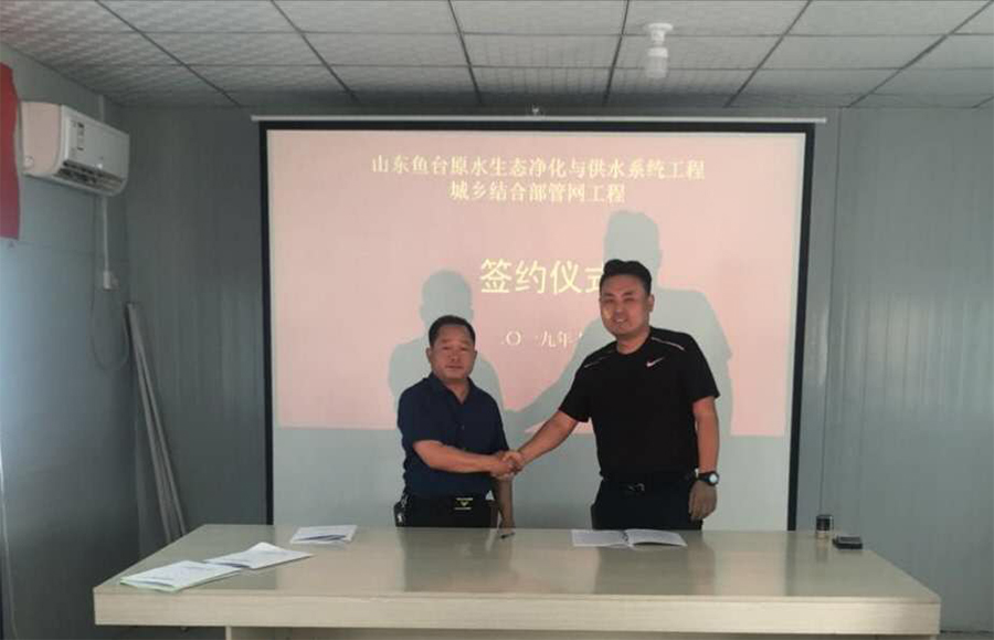5月21日下午,山東魚(yú)臺(tái)原水生態(tài)凈化與供水系統(tǒng)工程城鄉(xiāng)結(jié)合部管網(wǎng)工程施工簽約儀式在魚(yú)臺(tái)縣順利舉行。水發(fā)金水建設(shè)工程有限公司總經(jīng)理蘇福貴、山東水發(fā)賢達(dá)水務(wù)有限公司總經(jīng)理潘愛(ài)國(guó)出席并簽訂了合同。