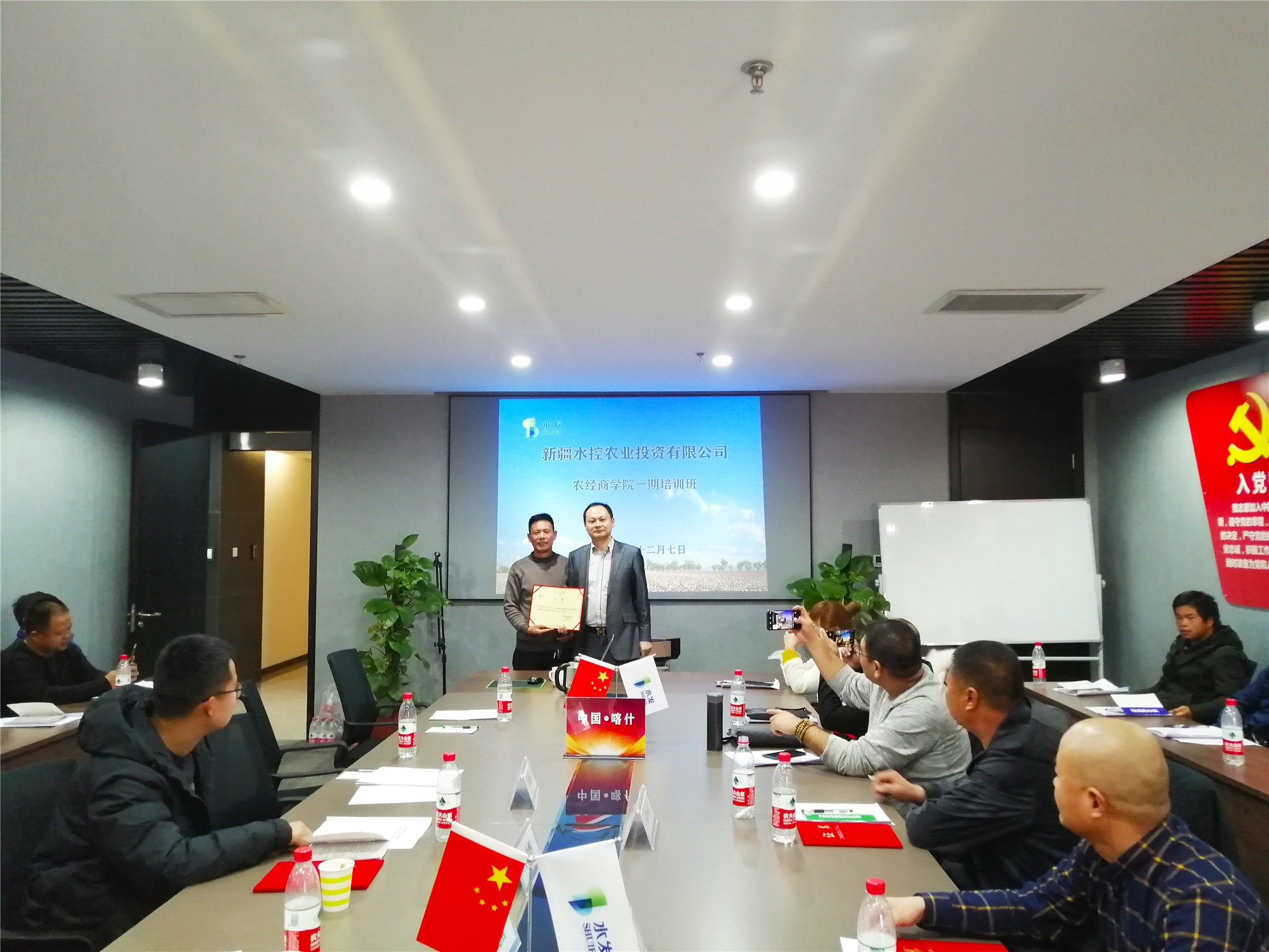 開班儀式上,王占先以“扎根新疆,合作共贏,共創(chuàng)農業(yè)全產業(yè)鏈閉環(huán)運營新模式”為主題,介紹了水控農發(fā)集團、新疆水控農業(yè)投資有限公司的發(fā)展歷程、現(xiàn)狀、未來五年的發(fā)展目標以及農業(yè)全產業(yè)鏈閉環(huán)運營的新模式。該模式以土地承包經營權為核心,全力整合上下游資源,實現(xiàn)“土地流轉分包-智慧農業(yè)管理-農資農機及融資服務-棉花收購加工銷售”的閉環(huán)運營,打造上下游多方利益共同體。該模式受到了與會種植合作單位代表的高度認同和積極參與。 高級農藝師李孟玉,曾創(chuàng)下了兵團棉花高產三連冠的佳績,李老師以“棉花水肥一體化運籌技術”為主題,向與會學員講授了棉花種植不同時期水肥運籌的關鍵技術點,并就學員遇到的實際困難和問題,進行了深入淺出的講解。公司科技部負責人、農藝師劉和平,以“南疆棉花、甜菜豐產栽培關鍵技術”為主題,對棉花、甜菜種植的全過程,進行了系統(tǒng)的講解。公司副總經理管海龍,向與會學員介紹了水控農發(fā)集團的具體惠農政策。培訓課程由公司副總經理張弛主持,在完成了預定培訓課程和筆試考核后,一期培訓班圓滿結束。