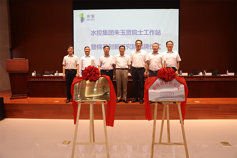 隨后,朱玉賢、潘軍、劉肖軍、吳東振、王西奎、劉琦、楊丙生一同為水控集團(tuán)朱玉賢院士工作站和棉花創(chuàng)新研究院揭牌。